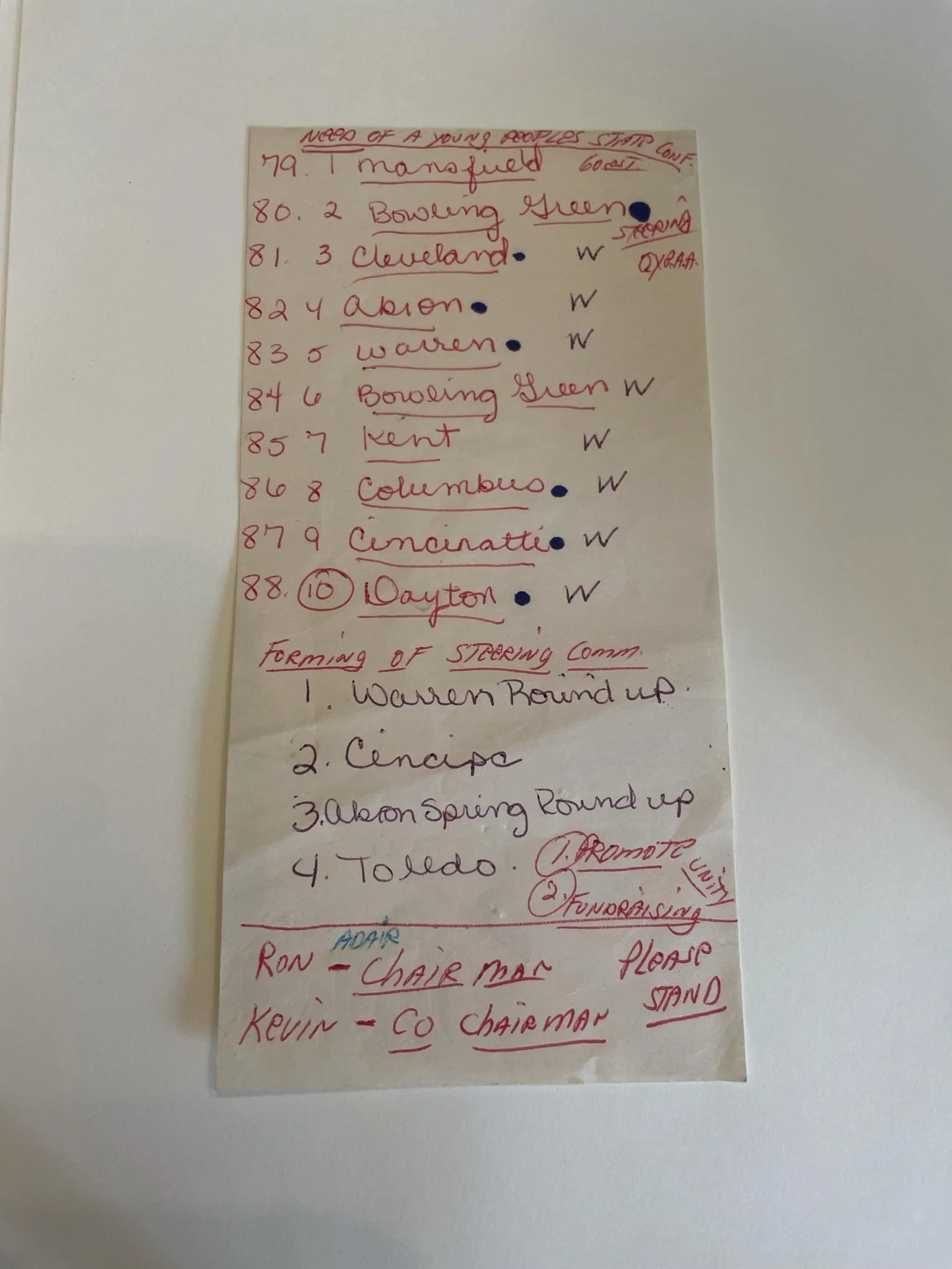 The 1981 conference T-shirt from Cleveland, preserved in our archives, features a classic design emblematic of early 1980s conference memorabilia. Crafted from durable cotton, the shirt displays the conference logo prominently on the front, accompanied by bold lettering and a graphic symbolizing unity and collaboration. Its vintage appeal offers a tangible link to the history and spirit of that year’s gathering, reflecting the culture and style of the era. This T-shirt remains a cherished artifact in our archives, embodying a memorable moment in the conference’s legacy.